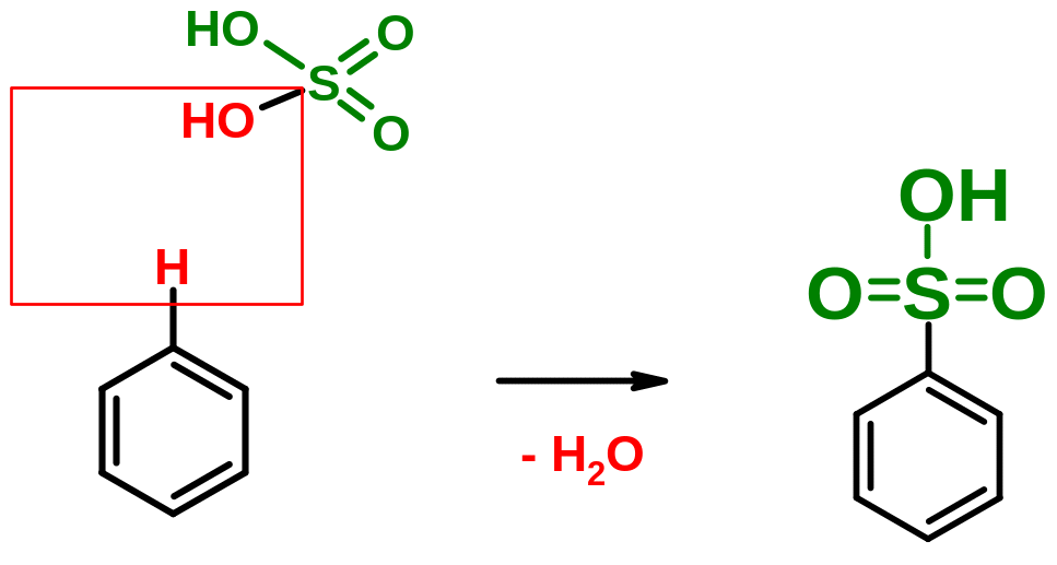 Пояснение: Реакция сульфирования бензола. Атом водорода подвергается замещению на сульфо-группу (SO3Н). Реакция в целом сопровождается отщеплением молекулы воды, что можно проиллюстрировать следующей схемой: