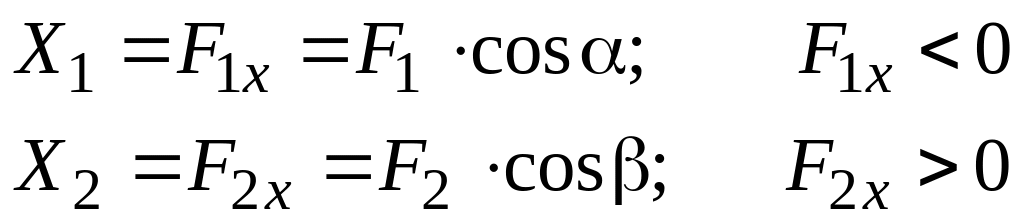 Векторная форма: . Координатная форма (ось Х параллельна линиям действия сил): 1. ; 2. . |