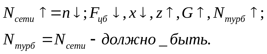 При любой нагрузке всегда установится равновесие – точка устойчивой нагрузки (процесс саморегулирования). Чтобы число оборотов при нагрузке n2 уменьшить до n1, необходимо снизить расход через турбину до G2. Чтобы мощность турбины была равна нагрузке генератора, необходимо уменьшать расход.
