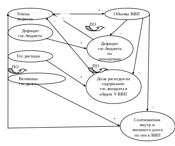 В этом примере с помощью диаграммы ПСС показаны характеры влияния изменения таких показателей как дефицит гос.бюджета, госэ.расходов и величины гос.долга на изменение темпа эк.роста. эти взаимосвязи могут быть представлены в виде след.фрагмента диаграммы ПСС между принятыми характеристиками бюджета страны и темпами эк.роста.