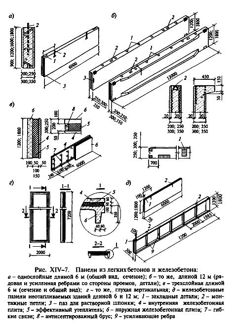 Однослойные панели из легких бетонов рассчитаны на применение в отапливаемых зданиях с температурой внутреннего воздуха 1б-18°С и относительной влажностью до 60%. Их изготавливают из ячеистых бетонов, керамзитобетона, перлитобетона, аглоперлитобетона, шлакопемзобетона и других легких бетонов плотностью 600... 1200 кг/м3. В зависимости от климатического района строительства толщина панелей может составлять 160...350 мм (рис. X1V-7, а, б). Панели длиной 12 м выполняют предварительно напряженными.