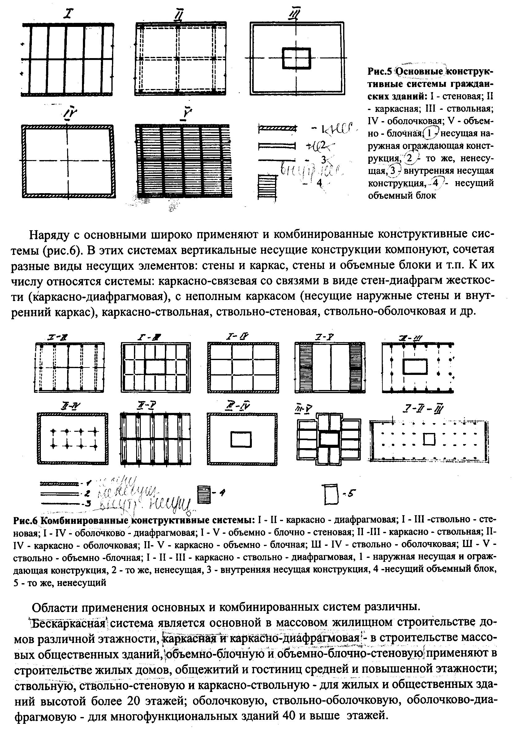 Бескаркасная система является основной в массовом жилищном строительстве домов различной этажности, каркасная и каркасно-диафрагмовая - в строительстве массовых общественных зданий, объемно-блочную и объемно-блочно-стеновую применяют в строительстве жилых домов, общежитий и гостиниц средней и повышенной этажности; ствольную, ствольно-стеновую и каркасно-ствольную - для жилых и общественных зданий высотой более 20 этажей; оболочковую, ствольно-оболочковую, оболочково-диа- фрагмовую - для многофункциональных зданий 40 и выше этажей.