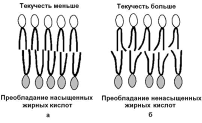 Рисунок 14.8. Влияние жирнокислотного состава фосфолипидов на текучесть липидного бислоя.
