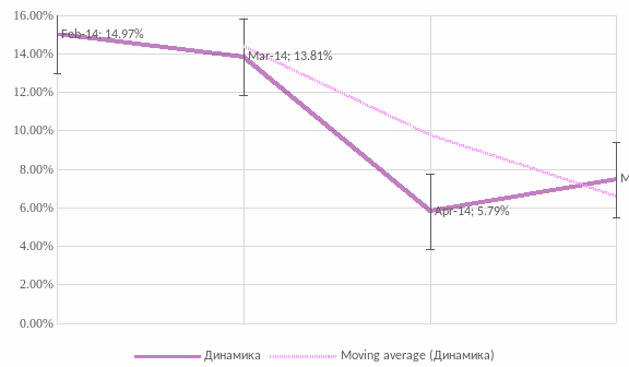 Вектор «a» отражает динамику показателя акцептации. В данной ситуации показатель акцептации довольно низкий. Тем не менее, изменения показателя колеблются на 1-2%, что говорит о его стабильности. В такой ситуации лучшей стратегией будет сохранять значение показателя на максимально возможном на данный момент времени. В долгосрочной же перспективе следует приложить усилия по повышению значения показателя путем активного стимулирования сбыта.