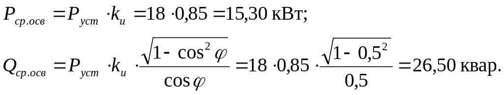 Определим среднюю мощность основного освещения, принимая cosφ=0,5: