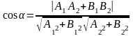 Нехай маємо дві прямі d1: A1x+B1y+C1=0 та d2: A2x+B2y+C2=0. Тоді 1=(-В1, А1) та 2=(-В2, А2) – їх направляючі вектори і за наслідком 10 знаходимо косинус кута між прямими: