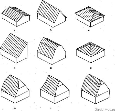 Рис. 1. Виды скатных крыш: а — пологая двухскатная; б — крутая двухскатная; в — вальмовая четырехскатная; г — односкатная (в форме парты); Д — ломаная (мансардная) двухскатная; е — шатровая четырехскатная; ж, з, и — полувальмовые (мансардные) четырехскатные.