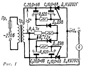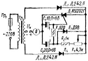 Пока на управляющий электрод не подан положительный сигнал определенной амплитуды со схемы запуска, тиристор не пропускает ток в прямом направленип. Через некоторый произвольный угол задержки а между напряжениями на управляющем электроде и катоде прикладывается положительный запускающий сигнал, вызывающий протекание тока через тиристор и соответственно через нагрузку. При перемене полярности напряжения на аноде тиристора последний закрывается независимо от величины управляющего напряжения, при этом аналогично рассмотренному ранее начинает работать другое плечо схемы. Регулируя угол задержки включения а по отношению к приложенному напряжению, можно изменять соотношение фаз начала протекания тока и приложенного напряжения и регулировать величину среднего значения выпрямленного тока (напряжения) нагрузки от максимума (а = 0) до нуля (а = Пи). Угол задержки включения тиристоров Д1 и Д4 изменяется потенциометром R1. Диоды Д3 защищают цени управления (запуска) от отрицательного напряжения в то время, когда напряжение на анодах тиристоров отрицательное. Для получения широких пределов регулировки а (0 — Пи) применены RC - цепи. В выпрямителе (рис.2) тиристор и схема запуска работают как в положительный, так и в отрицательный полупериоды, время разряда конденсаторов сокращается, что приводит к уменьшению диапазона изменения угла а и, соответственно, к уменьшению пределов регулирования напряжения на нагрузке. Для устранения этого явления включен диод Д3.