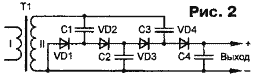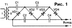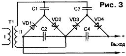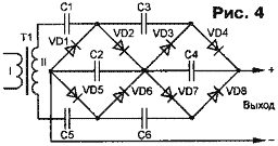 Очевидно, что запуск умножителя происходит за несколько периодов переменного напряжения. Постоянное выходное напряжение складывается из напряжений на последовательно включенных и постоянно подзаряжаемых конденсаторах С2 и С4 и составляет 4Uа.
