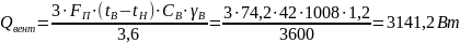 Теплопотери на вентиляцию данного помещения из расчёта 3 м3/ч на 1 м2 площади при расчётных температурах внутреннего и наружного воздуха состовляет: