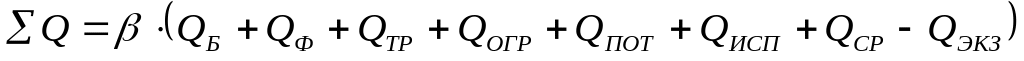 где Q – суммарный расход теплоты за период или в соотвествующей зоне ТВО, кДж/ч; QБ, QТР, QФ, QОГР, QПОТ, QИСП, QСР – количество теплоты, необходимое соответственно для нагрева бетона, транспортных средств, формы, ограждений, на потери в окружающую среду, на испарение воды затворения, на нагрев среды установки; QЭКЗ – количество теплоты, выделяющееся в процессе реакции гидратации цемента; β – коэффициент запаса на нерасчитываемые затраты теплоты (β=1,05-1,2), принимаем β=1,1.