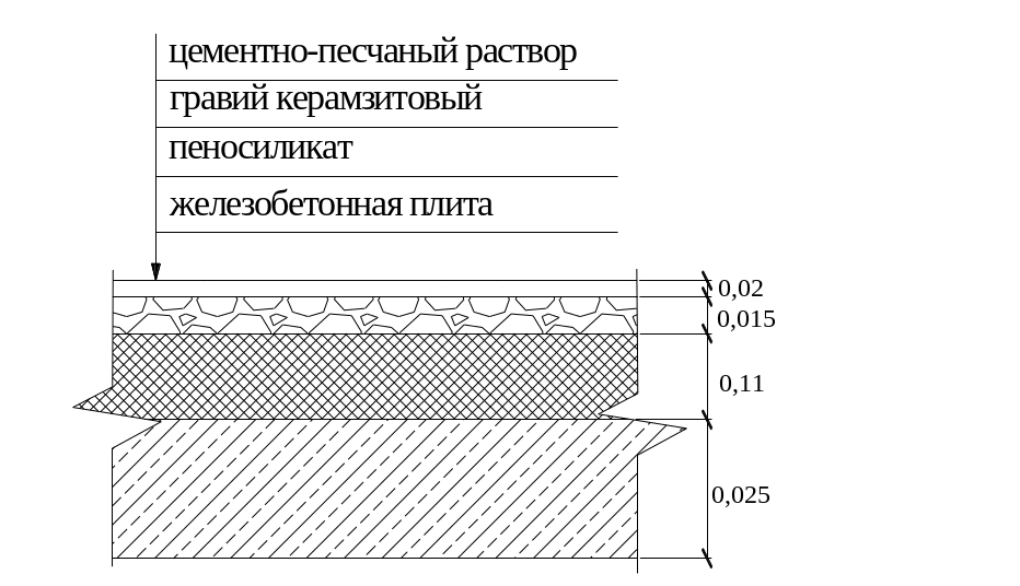 Положение плоскости возможной конденсации в данной конструкции находится на границах слоя цементно-песчаного раствора и гравия керамзитового.