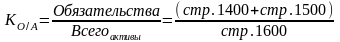 Показывает удельный вес кредитов, займов и кредиторской задолженности в общей сумме источников имущества организации. Данный коэффициент в сумме с коэффициентом концентрации собственного капитала равен 1 или 100 %. |