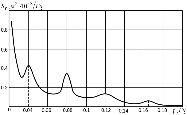 Два других максимума объясняются специфическими процессами, возникающими в системе, при воздействии на нее последовательности периодически повторяющихся импульсов. В нашем случае такие импульсы возникают при проходе болтовых или сварных стыковых соединений. В механике доказано, что в отличие от непрерывно действующего возмущения, при котором возникает один резонанс, воздействие периодически повторяющихся импульсов вызывает резонансы не только на основной частоте их повторения, но и на кратных частотах. Этим явлением объясняется наличие двух последующих максимумов на частотах 0,08 Гц и 0,12 Гц, соответствующих длинам неровности 12,5 м и 8,3 м.