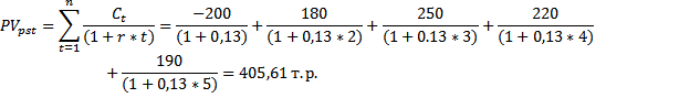 Б) Определим стоимость денежного потока при условии начисления простых %: