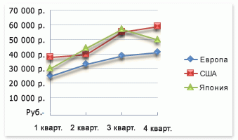 Данные, расположенные в столбцах или строках листа, можно представить в виде графика. Графики позволяют изображать непрерывное изменение данных с течением времени в едином масштабе и идеально подходят для представления тенденций изменения данных с равными интервалами. На графиках данные категорий равномерно распределяются вдоль горизонтальной оси, а все значения равномерно распределяются вдоль вертикальной оси, например, рисунок 10.