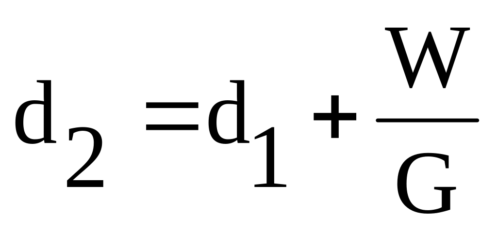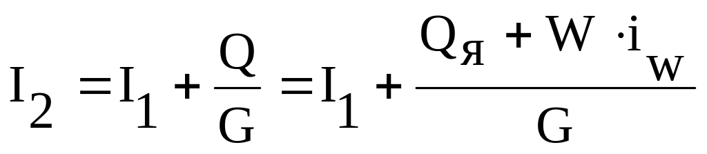 где Q − теплота процесса, кДж/кг; G − массовый расход воздуха, кг/с; I1, I2 − энтальпия соответственно начального и конечного состояний воздуха, кДж/кг; W − количество влаги, кг/с; d1, d2 − влагосодержание соответственно начального и конечного состояний воздуха, кг/кг.