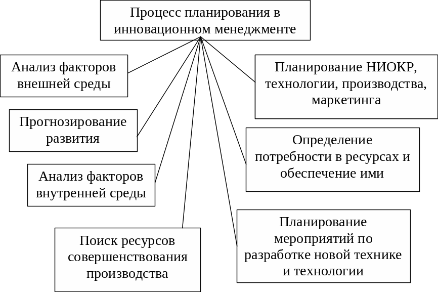 Планирование — это специальная функция инновационного менеджмента, состоящая из управления системой мероприятий по анализу факторов внешней и внутренней среды, прогнозированию деятельности организации и по планированию реализации стратегий фирмы и достижения поставленной цели. Процесс планирования подразделяется: