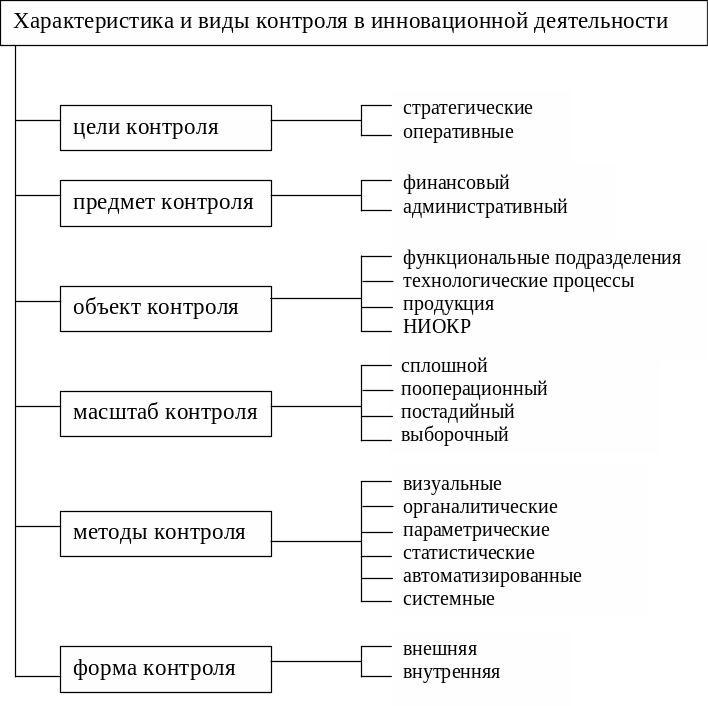 По предметно-содержательной структуре контроль подразделяется на финансовый, основанный на анализе финансового состояния предприятия и финансовой эффективности новшества, и административный. Объектом административного контроля выступают деятельность подразделений, выполнение плановых заданий, сроков поставок, обеспечение ресурсами, выполнение произведенной программы, планов исследований и разработок.