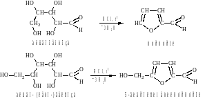 В концентрированных растворах кислот при нагревании моносахариды подвергаются дегидратации. Отщепляя по три молекулы воды, альдопентозы образуют фурфурол, а альдо– и кетогексозы  5–гидроксиметилфурфурол: