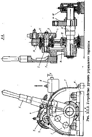 На рис. 12.З показано устройство ручного управления тормозом, смонтированное на отдельном валу. Тормозная рукоятка 5 приварена к ступице 9 зубчатого сектора, закрепленного на балу 13 шпонкой. Вал смонтирован на сферических подшипниках 12, корпуса 10 и 15 которых закреплены болтами на отдельной плите 8. Регулируемой по длине тягой рычаг 14 соединяется с рычагом коленчатого вала, синхронно воспринимающим движения тормозной рукоятки. Рассматриваемое устройство используется для дистанционного управления ленточным тормозом буровых лебедок.