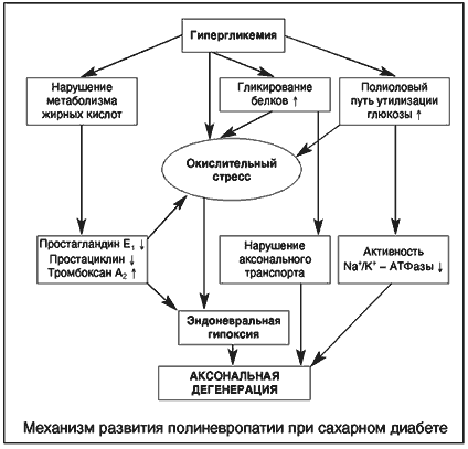 Диабетическая полинейропатия (ДП) развивается у лиц, страдающих сахарным диабетом и встречается у половины больных. Она может быть первым проявлением диабета или возникать через несколько лет после его начала. Наиболее существенными механизмами в развитии невропатии являются ишемические и метаболические нарушения в нерве.
