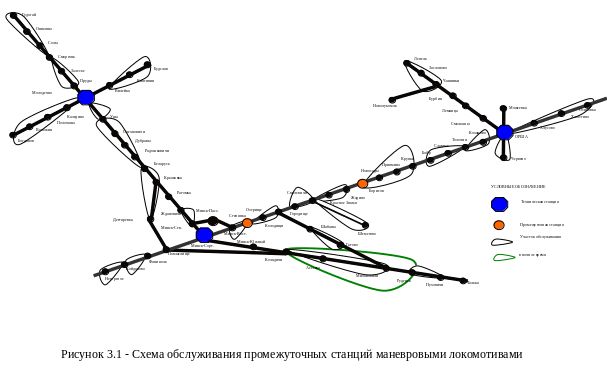 Дислокация маневровых и вывозных локомотивов приведена в таблице 8. Применение схем развоза местного груза может, меняется в зависимости от объёмов и структуры местного вагонопотока. Количество маневровых и вывозных локомотивов комбинируется в зависимости от объёмов работы. Схема обслуживания промежуточных станций маневровыми локомотивами приведена на рис 3.1