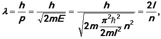 Условие квантования энергии имеет простой смысл: на длине ящика должно уложиться целое число длин волн де Бройля. Действительно,