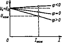 Внешние характеристики синхронного генератора при активной (φ = 0), активно-индуктивной (φ > 0) и активно-емкостной (φ < 0) нагрузках приведены на рис. 11.6. Они являются наглядной иллюстрацией того, что говорилось в § 11.4 о влиянии характера нагрузки на напряжение генератора.