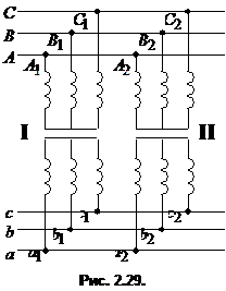 Параллельное включение трехфазных трансформаторов осуществляется по схеме, приведенной на рис. 29. При параллельной работе трансформаторов возникает проблема обеспечения равномерного распределения нагрузки между ними. Равномерность распределения нагрузки обеспечивается в том случае, если трансформаторы имеют