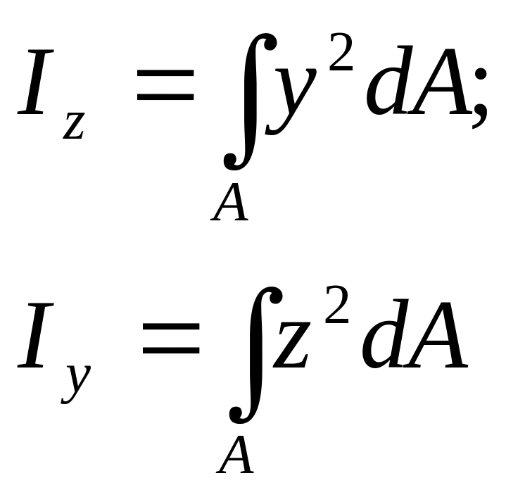 Осевым моментом инерции сечения называется взятая по всей площади сечения сумма произведений площадей элементарных площадок и квадратов расстояний от них до оси. Так, моменты инерции сечения относительно координатных осей OZ и OY Отбудут соответственно равны: