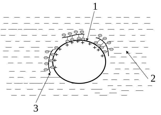 Рис. 2.3. Дія гідрофілізуючої добавки-пластифікатора ПАР: 1 – частинка цементу; 2 – вода; 3 – молекули добавки з негативним зарядом на поверхні