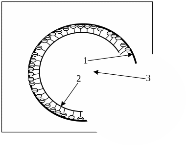 Рис. 2.4. Дія гідрофобізуючої добавки-пластифікатора ПАР: 1 – стінка пори; 2 – адсорбційний шар ПАР; 3 – вода, повітря.