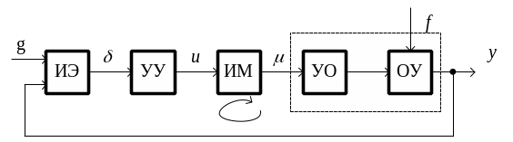 Указываются также обозначения основных переменных системы управления: g – закон управления, y – управляемая переменная (выход объекта и системы); u – управляющее воздействие (информационная компонента); - управляющее воздействие (энергетическая компонента); – отклонение управляемой переменной от заданного значения; f – возмущающее воздействие среды.