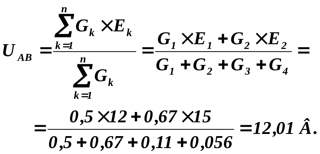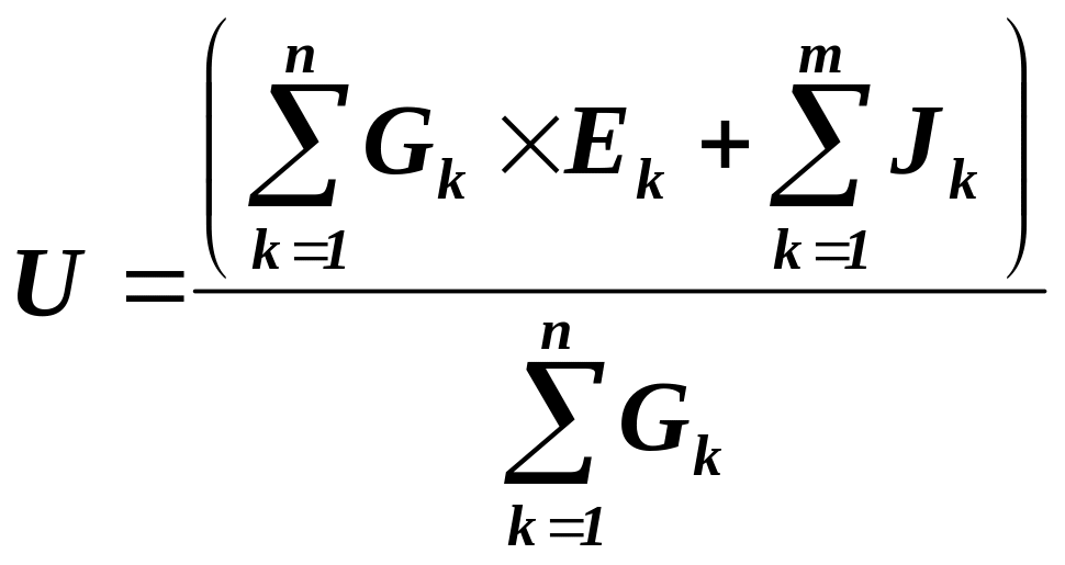 Спочатку обчислюють міжвузлову напругу у відповідності з виразом: