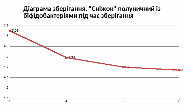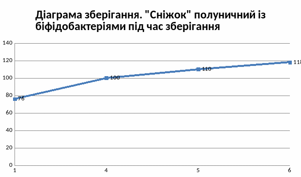 Кисломолочний напій «Сніжок» полуничний із біфідобактеріями мав міцний згусток на протязі 5 діб зберігання. Лише на 6 добу почала виступати сироватка і подальше руйнування згустку.