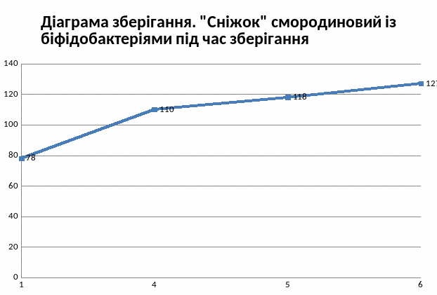 Кисломолочний напій «Сніжок» смородиновий із біфідобактеріями, мав міцний згусток на протязі 4 діб, на 5 добу зберігання проявились незначні порушення згустку. А вже на 6 добу почалось подальше руйнування згустку.