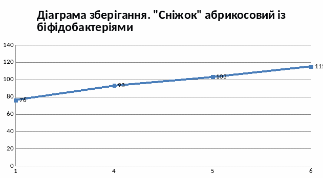 Кисломолочний напій «Сніжок» абрикосовий із біфідобактеріями мав міцний згусток на протязі 5 діб зберігання. Лише на 6 добу почала виступати більше сироватки і відбулось незначне руйнування згустку.