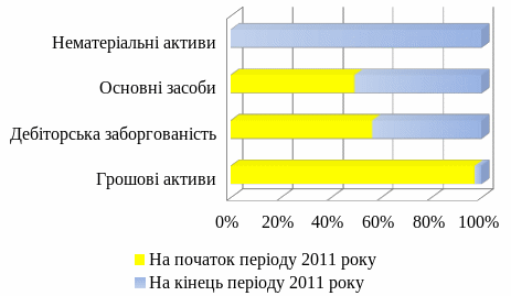 Майно підприємства складається з оборотних і необоротних активів. За даними таблиці можна сказати, що на початку 2012 року необоротні активи займали 35,52%, а на кінець періоду 44,41%. На кінець періоду їхній обсяг збільшився на 8,88%, що є сприятливим для підприємства, оскільки грошові кошти спрямовуються на його розширення.