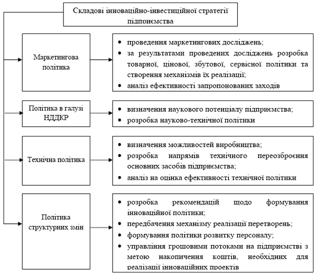 Стратегія управління інвестиційно-інноваційною діяльністю підприємства - це розробка стратегії, за якою визначаються найдоцільніші способи та шляхи вкладення інвестиційних ресурсів у процес, який спрямований на впровадження науково-технічних розробок з метою освоєння випуску конкурентоспроможної інноваційної продукції та покращення її якості, постійне удосконалення технології виготовлення та зайняття оптимальної ніші підприємством як на внутрішньому так і зовнішньому ринках [15, с. 48].