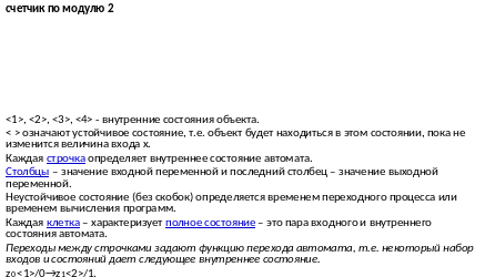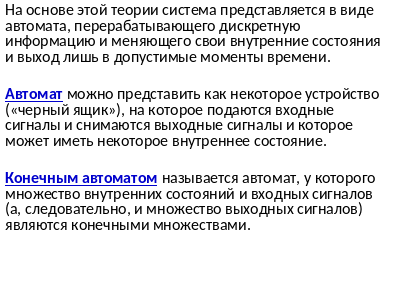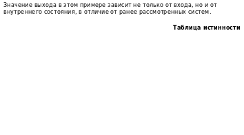 Понятие «состояние» автомата означает, что выходной сигнал автомата зависит не только от входных сигналов в данный момент времени, но и учитывает входные сигналы, поступающие ранее. Это позволяет устранить время как явную переменную и выразить выходные сигналы как функцию состояний и входных сигналов.