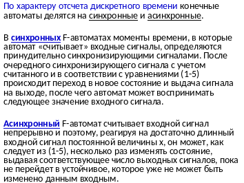 Всякий переход автомата из одного состояния в другое возможен не ранее, чем через дискретный интервал времени. Причем сам переход считается, происходит мгновенно, то есть не учитывают переходные процессы в реальных схемах.