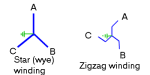 -соединение («зигзаг»). При данном способе соединения каждая фазная обмотка состоит из двух одинаковых частей, размещенных на разных стержнях магнитопровода и соединенных последовательно, встречно. Полученные три фазные обмотки соединяются в общей точке, аналогично «звезде». Обычно применяется «зигзаг» с отводом от общей точки (
