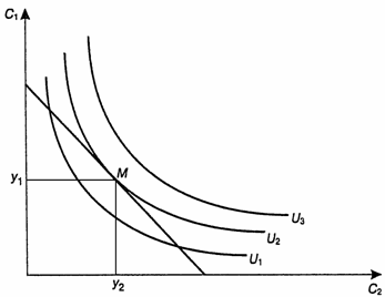 Точка М – оптимум потребителя – точка касания бюджетной линии с наиболее отдаленной кривой безразличия указывает на искомый набор покупаемых благ, обеспечивающих максимальную удовлетворенность.