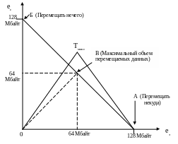 Построим график, отображающий возможные варианты соотношения свободной и занятой памяти. На оси абсцисс будем откладывать значение занятой памяти - eз, а на оси ординат – свободной памяти – eс. Тогда любой точке прямой АБ соответствует некоторый вариант соотношения свободной и занятой памяти. В точке А вся память занята и, следовательно, некуда перемещать, да и нет необходимости. В точке Б вся память свободна и нечего перемещать. Как видно на рис. 1, максимальный объем перемещаемых данных (64 Мбайт) соответствует точке В. Определим время уплотнения данных для этого случая. Для этого сначала найдем число слов, которое нужно считать и, соответственно записать в память в процессе уплотнения: