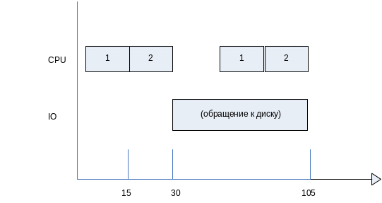 Вероятность того, что все три программы находятся в ожидании ввода вывода=(1/3)в кубе. Следовательно пропадает (1/27) процессорного времени. Если число программ удвоить, то вероятность ввода вывода=(1/3)в шестой = 1/729. Столько времени CPU простаивает.