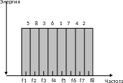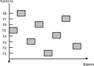 На данных графиках приведен пример передачи сигнала со скачкообразной перестройкой частоты (frequency hopping — FH). Для передачи FH-сигнала резервируется определенное количество каналов. Как правило, используют несущих частот, которые составляют каналов. Расстояние между несущими частотами (а, следовательно, ширина каждого канала) обычно равно ширине полосы входного сигнала. При передаче каждый канал используется в течение фиксированного интервала времени; в стандарте IEEE 802.11, например, этот интервал равен 300 мс. В течение такого интервала производится передача некоторого количества закодированных определенным образом битов . Последовательность использования каналов задается кодом расширения, и поскольку приемник и передатчик используют один и тот же код, переходы между каналами выполняются синхронно.