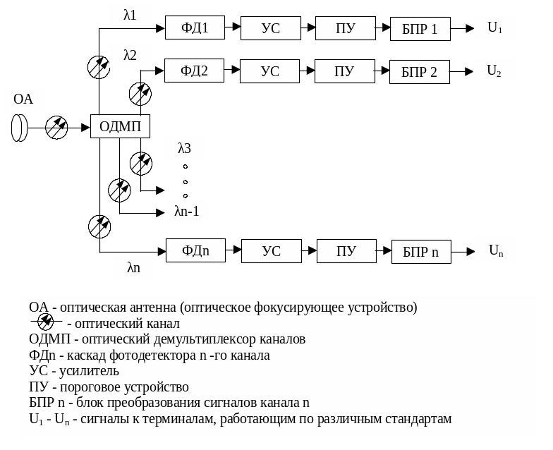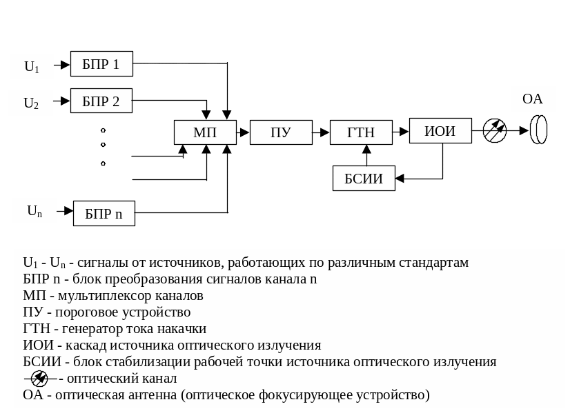 Оптическое передающее устройство с мультиплексором каналов в радиодиапазоне (рис.1.2) предназначено для передачи n - сигналов от источников, работающих по различным стандартам, например от телефона, факса, цифровой АТС, локальной компьютерной сети, станции приема телевизионных каналов.