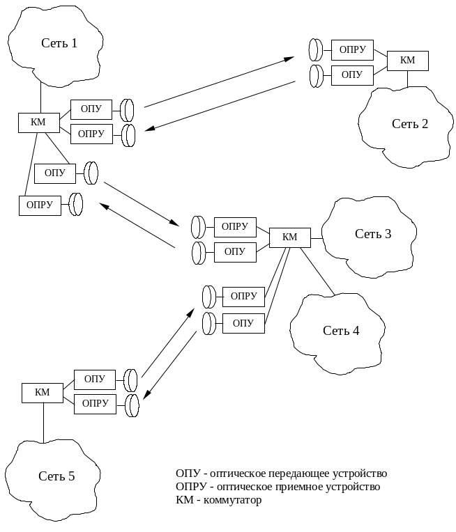 Каждая ячейка сети на основе электрических кабелей (как правило это витая пара), через коммутатор КМ подсоединяется к cистеме оптического доступа. ООСД состоит из оптических передающего (ОПУ) и приемного (ОПРУ) устройств с оптическими антеннами, обеспечивающими концентрацию оптического излучения в заданном направлении.