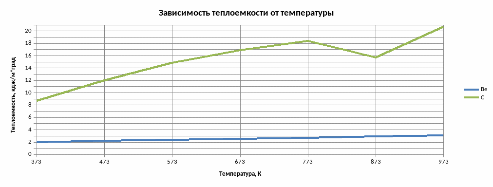 У бериллия значения теплоемкости меньше чем у графита, но у бериллия небольшая зависимость теплоемкости от температуры в сравнение с графитом.